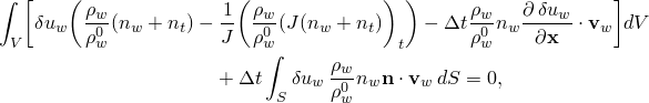 Equating the addition of liquid mass across the surface S to the rate of change of liquid mass within the volume V gives the wetting liquid mass continuity equation