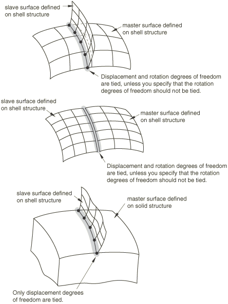 A surface-based tie constraint can be used to make the translational and rotational motion as well as all other active degrees of freedom equal for a pair of surfaces. By default, as discussed below, nodes are tied only where the surfaces are close to one another. One surface in the constraint is designated to be the slave surface; the other surface is the master surface. A name must be assigned to this constraint and may be used in postprocessing with Abaqus/CAE.